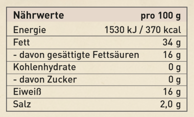 76% Rind- und Schweinefleisch*, Speck*, Käse*, Meersalz, natürliches Aroma*, Rauch